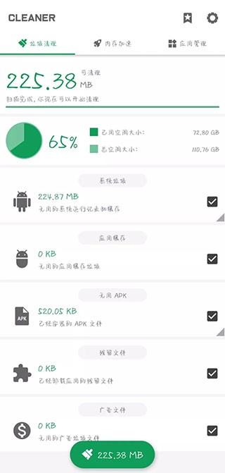 1、垃圾清理:简洁强大,可清理系统垃圾、应用垃圾、无用安装包等各类冗余数据。
