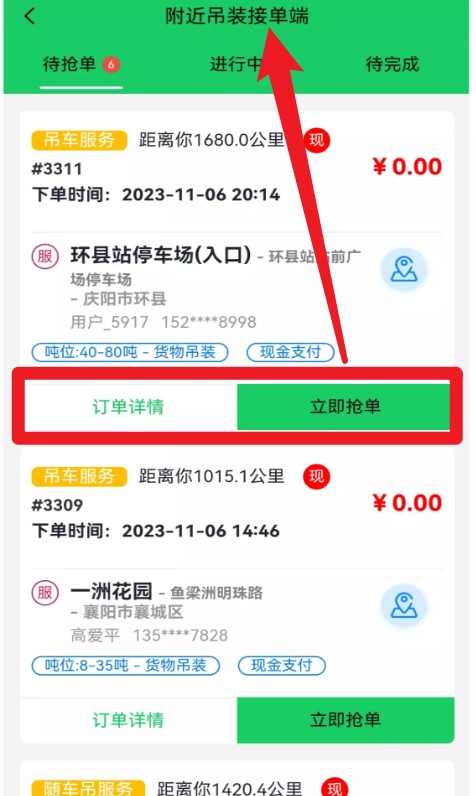 3、在吊装接单端可查看订单详情并点击立即抢单。