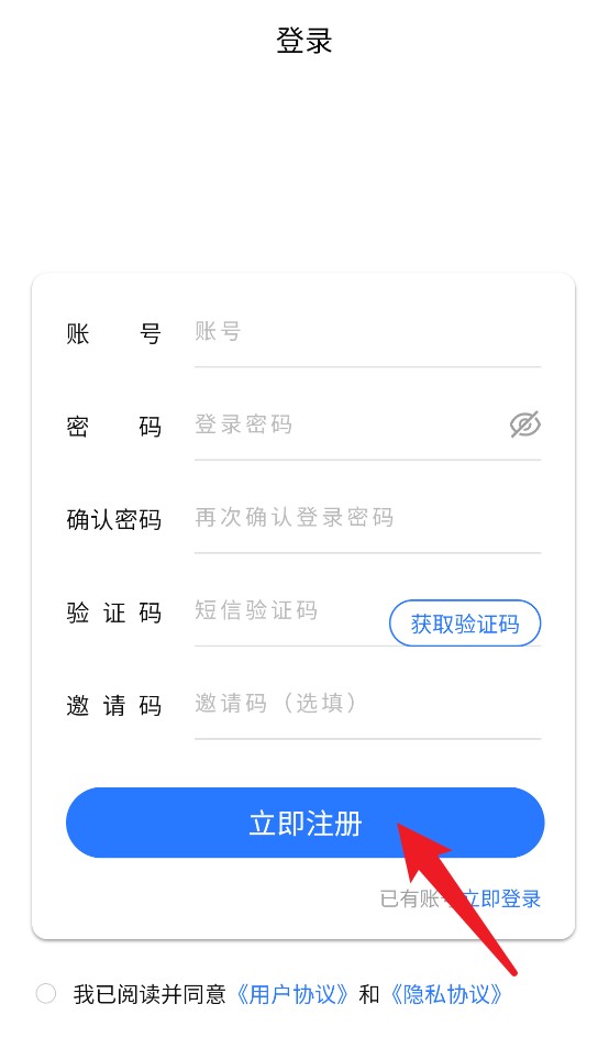 2、第一次使用,可点击立即注册,填写完整注册信息后点创建新账号。