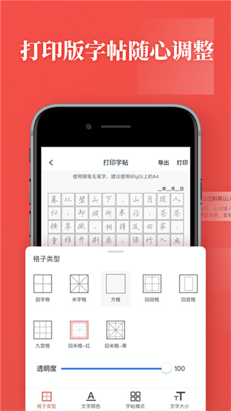 3、【打印版字帖】支持A4纸导出,可用手机连接打印机或将字帖发送到电脑打印。