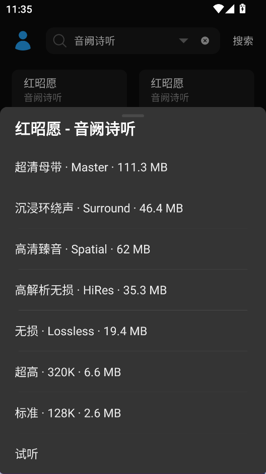 3、可以试听音乐,提供标准到超清母带音质的下载