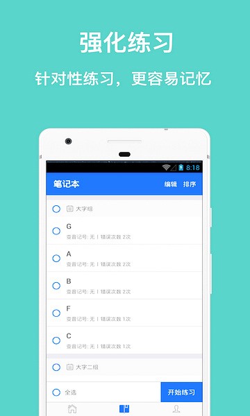 我们会将用户在练习过程中练错的音符记录到您的笔记本中,你可以在笔记本中挑选、组合音符来进行针对练习,消灭错误音符。