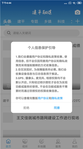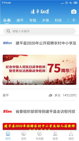 建平融媒是一款综合性的本地服务软件。它里面涵盖了很多的新闻资讯,像建平县时政、经济、民生、社会等新闻,也有建平广播电视台实时直播和节目回看。该软件还能够在手机上完成一些政务事项的在线办理、查询等内容。里面还提供了好多的便民服务,像水电、生活费的缴纳,社区中的重要通知提醒,生活出行和天气的查询等等。有需要的用户赶紧来下载吧!