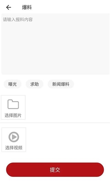 3、输入爆料内容、选择爆料选项、选择图片、选择视频,点击【提交】。