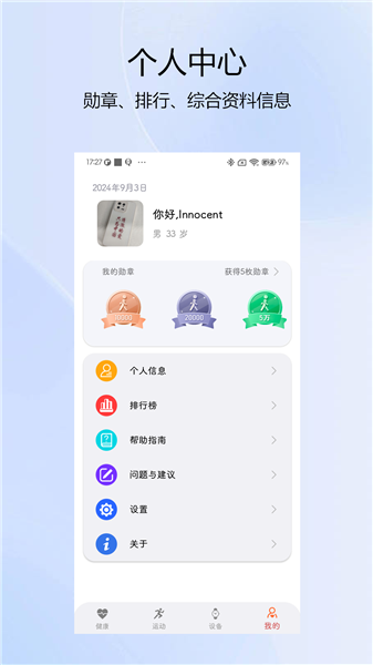 自定义设置个人信息,个性化头像和昵称让你独树一帜,勋章和排行榜体系更好的激发你的运动细胞;另外支持多语言切换,问题与建议的反馈,让我们能更加清晰客户的真实需求从而针对性的去完善产品