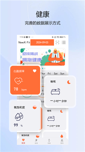 搭配手表记录个人步数、心率、睡眠、血氧、体重等日常健康数据,以图表的形式展示历史数据,让您更清晰的管理自身健康