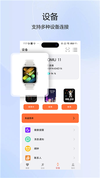 支持app与手表蓝牙一键连接,实时监测蓝牙状态级手表电量,另外搭配500+免费表盘市场,可以自由随意切换心仪的表盘;app提供健康提醒、消息通知、联系人等捷便设置,让手表和手机互通互联;另外提供固件升级、恢复出厂设置等功能,让用户可以免费享受当下