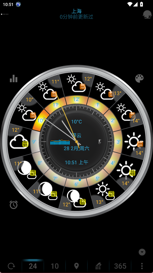 2、 可视化圆盘设计:采用独特的圆形界面展示气象趋势,直观呈现二十四小时内的天气变化规律,提升阅读体验。