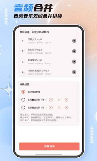 4、打开“音乐合并”页面后,大家还能够导入多个本地音频文件进行合并,长按并上下拖动音频,就可以调节音频的先后顺序!