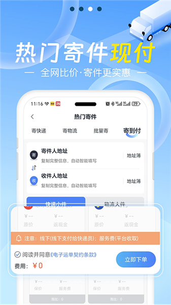 1、打开应用就能在线对快递进行下单,获得快递上门取货服务;