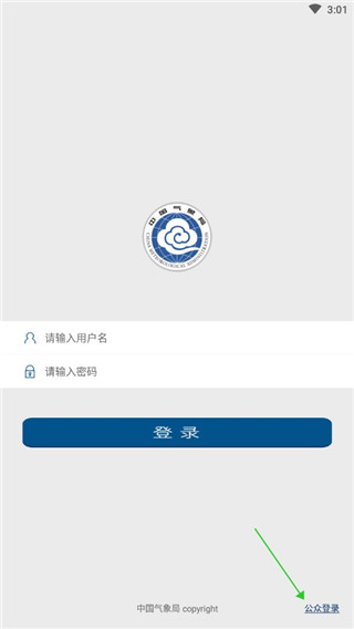 1、在本站下载安装中国气象局官方版 app,进入软件后点击右下角公众登录按钮。