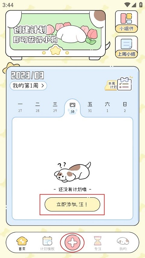 1、初次打开软件,可在首页添加计划,也可点击底部中心 “+” 新建计划。