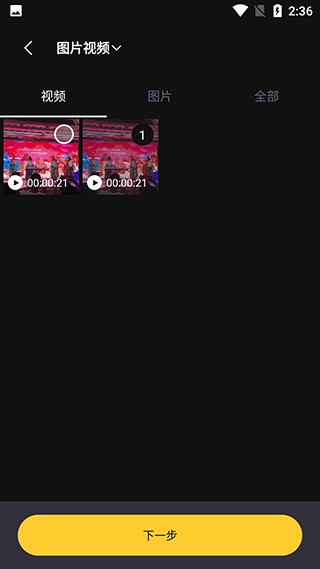 2、在素材库中选择需要剪辑的素材,可选择单个或多个素材进行后续编辑。