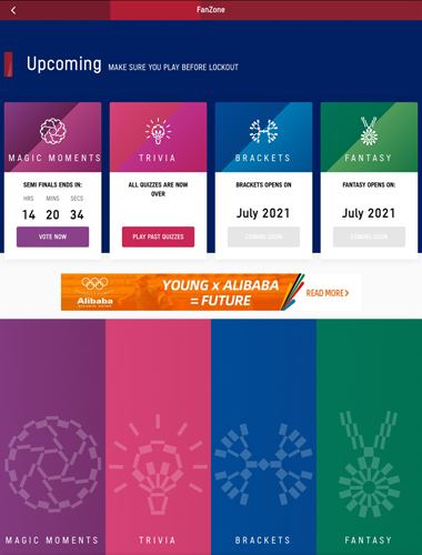 3、畅玩2020东京奥运粉丝区游戏:在“考考你”(trivia )考考自己,体验“神奇时刻”(magic moments)。