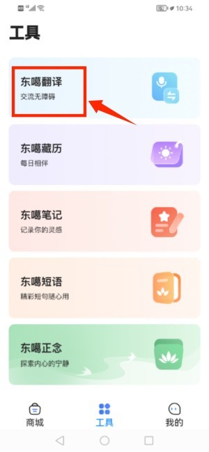 1、进入工具板块,选择东噶翻译功能,开启对应翻译服务。
