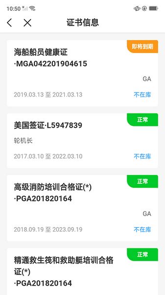 5、掌握实时信息,最新的个人在船履历以及证书实时状态与最新工资条等可以随时查询;