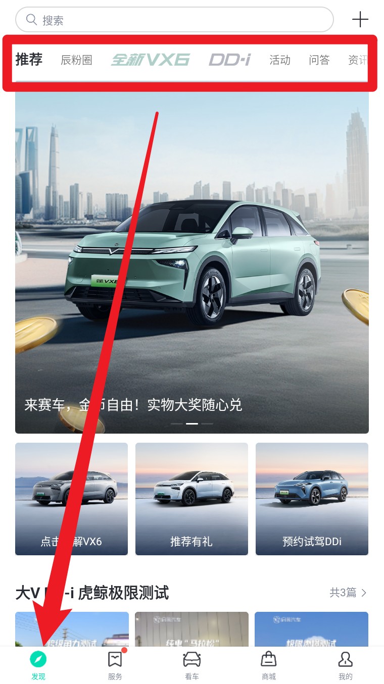 4. 点击底部导航栏最左侧的发现,可浏览推荐车型、社区活动与品牌最新资讯。