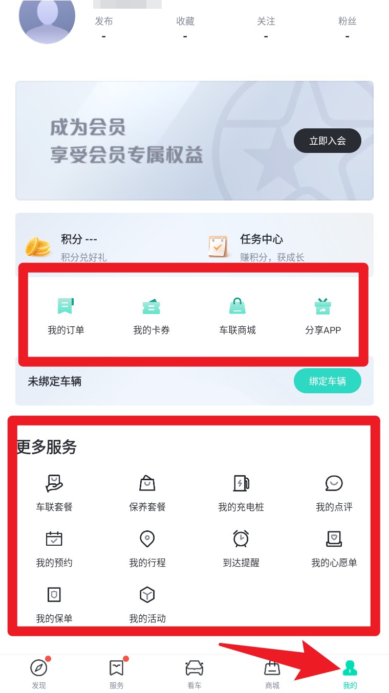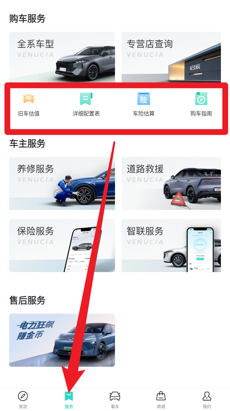 5. 进入服务页可查看购车与用车服务,如估值、配置表、维修救援、智能服务等内容。