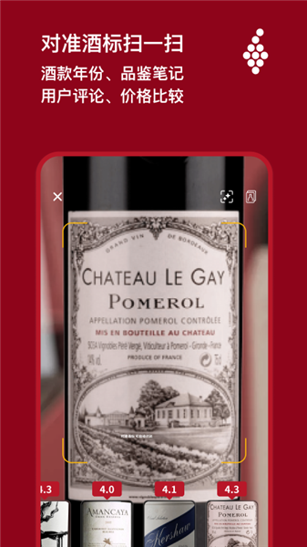 -选酒助手:当您在货架前犹豫徘徊时帮助您迅速了解您感兴趣的酒款的重要信息,包括评分、均价、口味风格、食物搭配等。