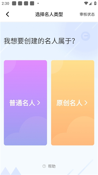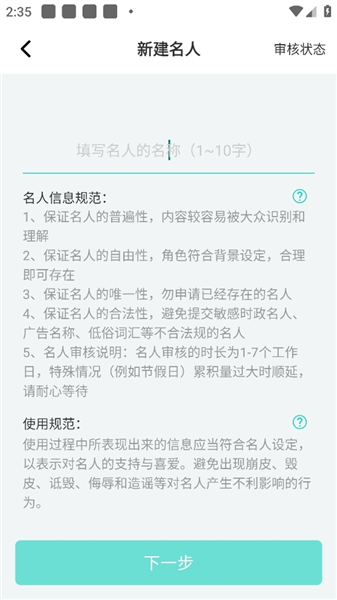 在主页面右滑拉出菜单,点击进入新建人物,按要求输入名人的头像、姓名、分类、名人介绍,确认无误后点提交击。提交后可在右上角审核状态中查看名人的审核状态(若是不通过可点击查看原因),显示审核成功就可以扮演该角色啦(正常审核周期为1天,节假日除外)
