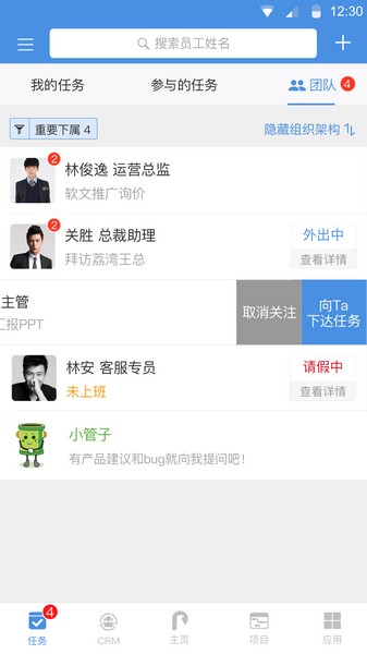 4、任务管理:随时随地了解团队成员任务进程,及时解决任务中的问题。