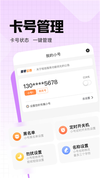 用户通过小号对来电或短信进行管理和屏蔽预防骚扰。