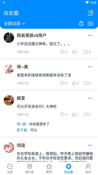 4、校友圈:汇聚众多同校师生群体,可以随时与他们进行交流互动;