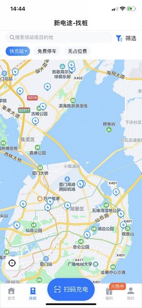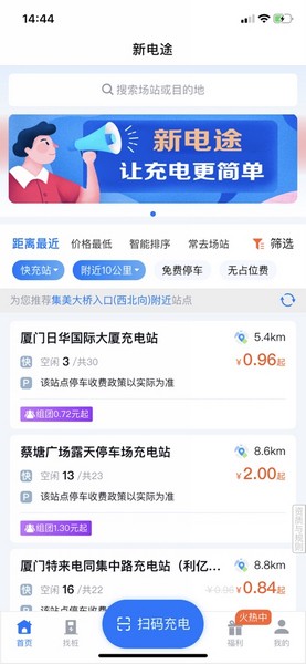 2、搜索场站:输入场站或者目的地名称搜索周边的充电场站资源;
