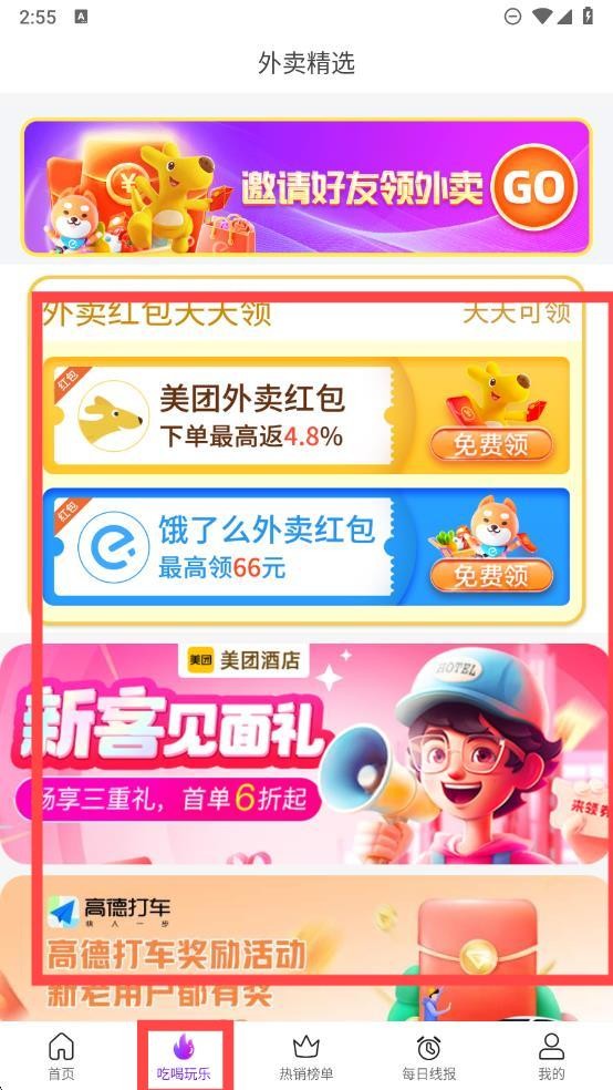 3、点击吃喝玩乐按钮,可领取外卖平台优惠券,同时参与酒店、打车等相关优惠活动。