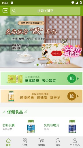3、首页支持输入关键词搜索保健品,还可浏览保健食品、健康家居、日化护肤等内容。