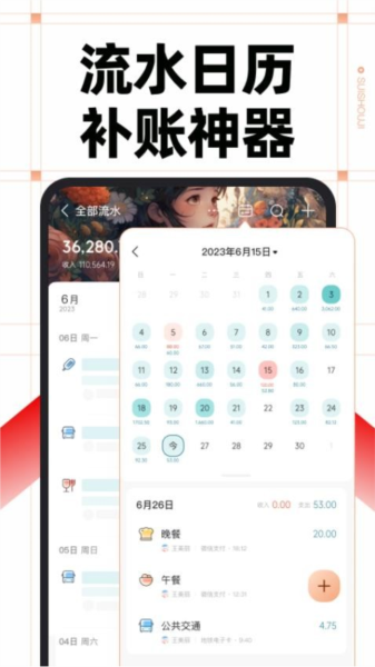流水日历清晰:集成的日历功能让每月的流水账目一目了然,有助于用户随时查阅任意一天的具体收支详情。