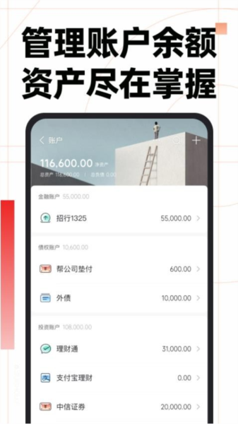 账户信息全面:支持添加多种类型的银行账户及现金账户,并可对其进行统一管理,方便用户随时掌握自身财务状况。