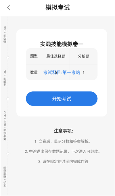 2、点击【开始考试】,和考试规则一样,在规定时间内完成作答,交卷后会显示分数和答案解析。