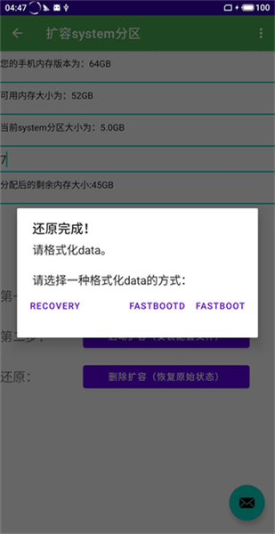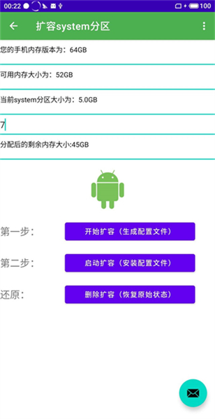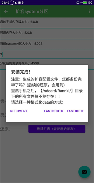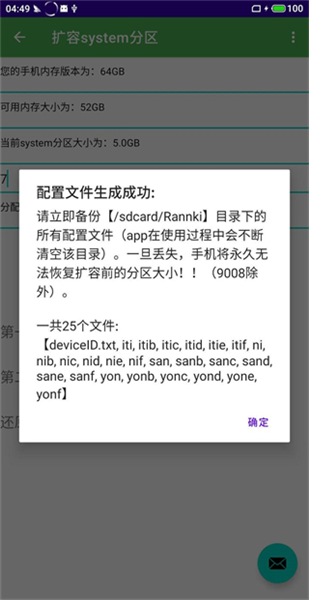 还原方法:提前将之前生成的25个扩容配置文件,复制到/sdcard/rannki目录中,点击删除扩容按钮,然后就会提示还原成功,像这样:
