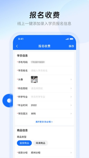 --试听管理:线上添加录入学员信息报名信息缴费记录信息;