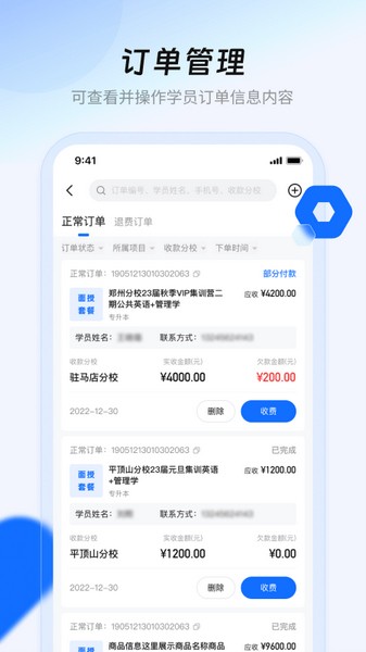 --订单管理:学员报名订单的详情内容,转班、缴费等订单可在移动端查看并进行编辑操作。