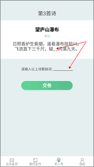 3、点击考一考即可参与古诗答题,答题过程中需准确输入对应的诗句完成挑战。