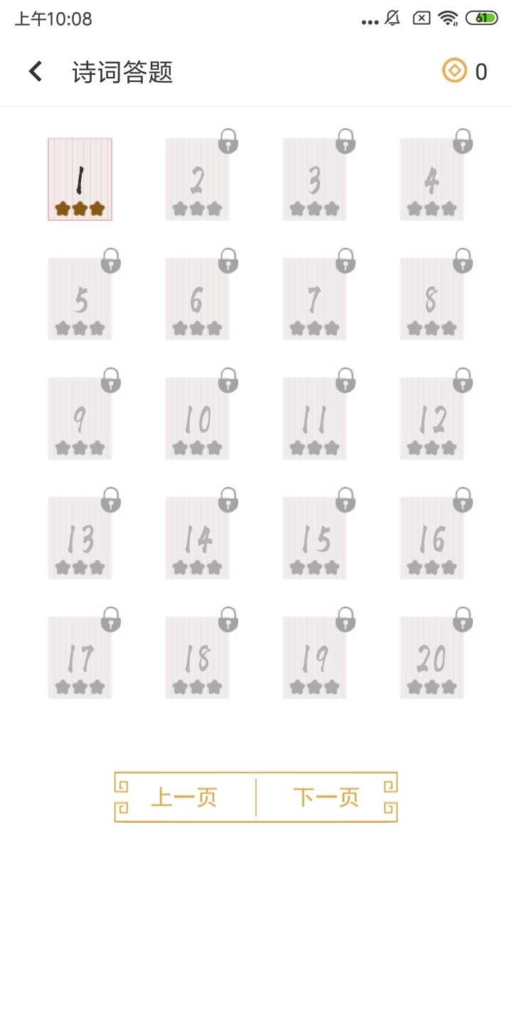 2、诗词答题模块,以答题闯关的方式,帮助使用者轻松背诵古诗词,巩固学习成果。