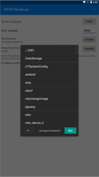 1.运行此应用后,点“Root directory”(根目录)右边的CHOOSE按钮,选择需要分享出去的文件夹路径,点确定。