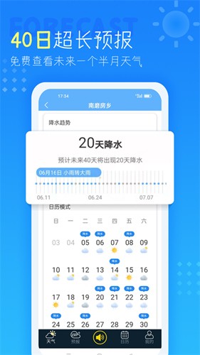 不仅可以提供分钟级降水预测,告诉你本地何时开始下雨、何时停雨,预计持续多久,让你随时了解天气变化。更有智能语音播报功能,涵盖本地和全国天气真人播报,早间资讯,健康百科,故事趣闻等内容,语音类别丰富多样,还支持多种方言切换,绝不让你感到枯燥。软件每日自动生成气象概率分析预报,让你以更科学的方式查看天气,告别天气不准的困扰。而且,现在你可以预测未来40天的天气情况,不再局限于15天预报,让你提前掌握未来一个半月的天气状况,生产生活更加有条不紊。