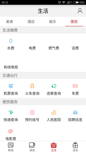 4、便民服务栏中又划分了不同分组,里面有生活缴费、交通出行以及便民服务等;