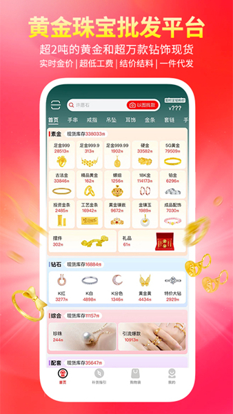 找金app是一款相当专业的金饰批发平台,囊括了戒指、手镯以及金条、耳坠等诸多品类,更有足金、古法金、3D硬金等详细的工艺分类,大家可以轻松找到所需要的金饰和商品。平台上的各类黄金饰品来自水贝这一知名的珠宝黄金首饰批发市场,制作精美,工艺优秀,更有超低的采购价格可以提供给大家,不管是金店商家还是个人用户都能够在平台上买得尽兴。