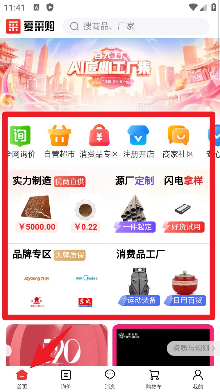 5. 返回首页可浏览各类专区商品,如品牌、源厂、定制等分类,直接选品或加入购物车采购。