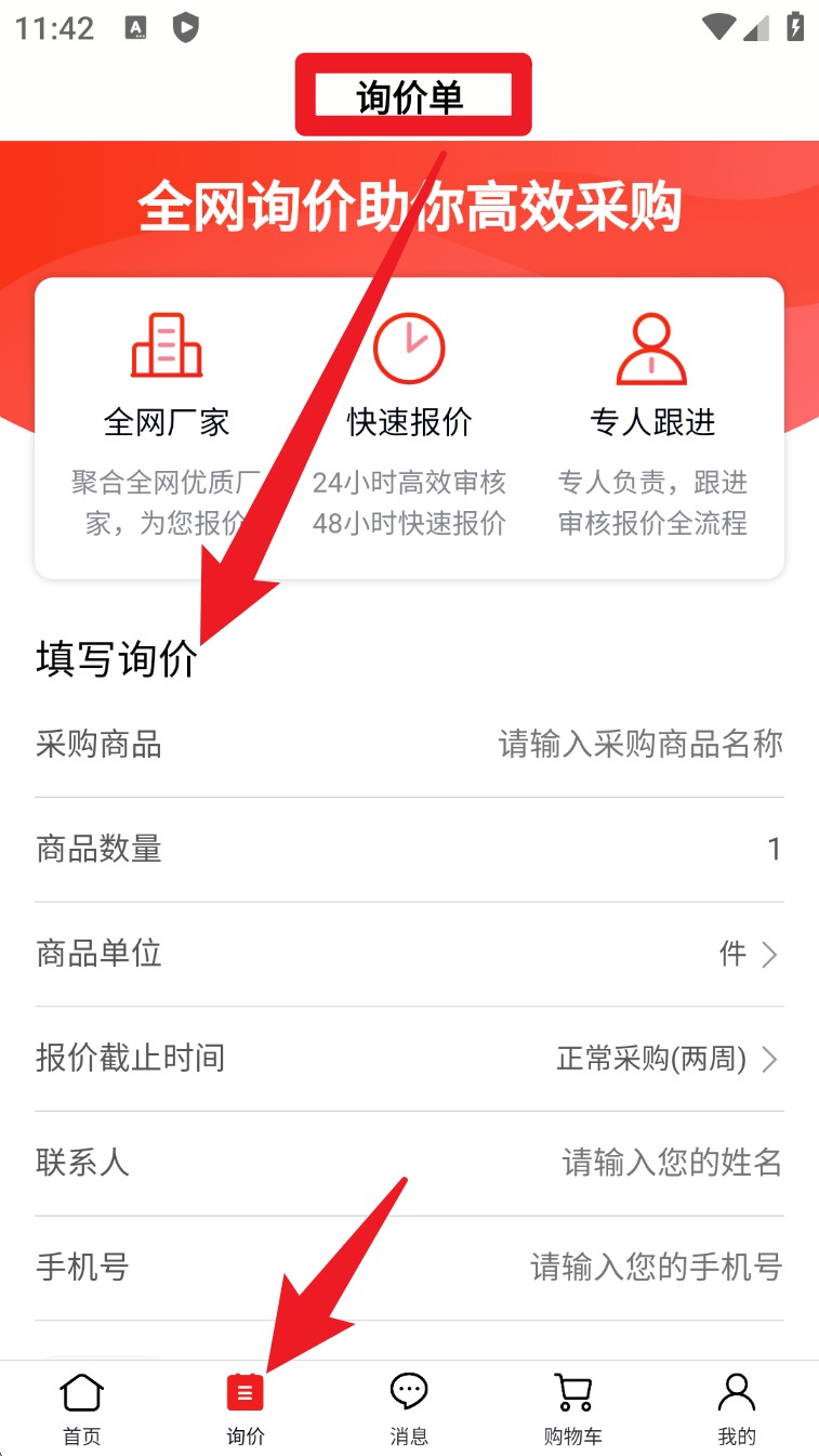4. 点击首页或询价菜单进入询价单页面,填写商品名称、数量等信息后提交询价请求。
