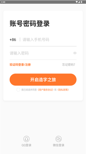 1、打开手迹造字app,进入软件前需先完成登录操作,方可正常使用所有功能。