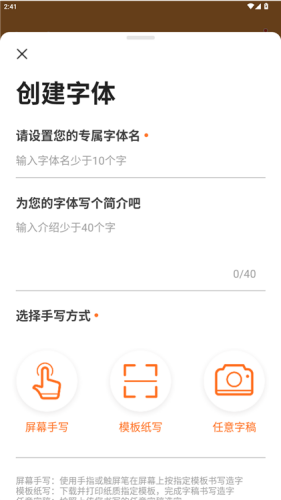 2、点击首页右下角加号开始创作字体,需先为字体命名(必填)并添加描述,再选择屏幕手写导入例字。
