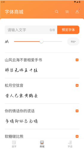 4、进入商城界面,可浏览并挑选心仪的原创字体,点击下载后即可直接使用。