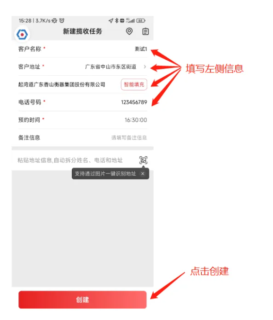 2、在新建揽收界面,完善客户信息,点击创建。
