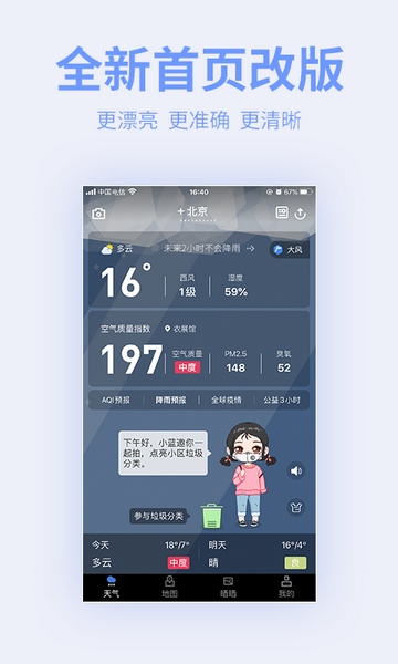 一、可视化动态的全球天气及空气信息图:来源权威且精确到区县的天气及空气质量动态预报,让你对蓝天和雾霾了然于胸,更有气象灾害和雾霾监测预警,台风动向也尽在掌控,不管阴晴风雨都保持淡定;口罩佩戴、运动、花粉浓度……贴心的生活服务提示全面呵护你的健康。