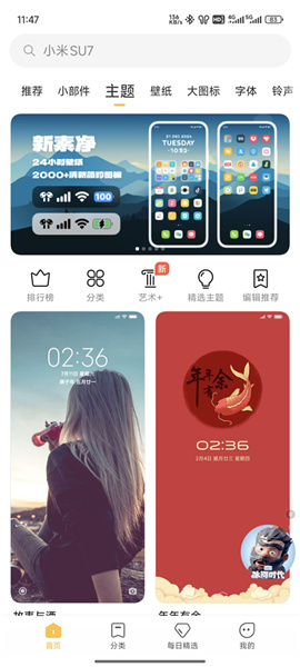 小米主题是一款为MIUI系统设计的主题美化软件,软件中通过壁纸、铃声、字体等不同的板块,并且按照文艺清新、唯美古典、游戏、风景、美女等不同的风格,为用户提供了海量、免费的主题内容。你可以把自己喜欢的主题下载保存,方便网友随时进行更换。小米主题app中提供的壁纸类型丰富,涵盖了热血动漫风、简约风、文艺风,以及唯美古典风等多种风格,总有一款适合你。